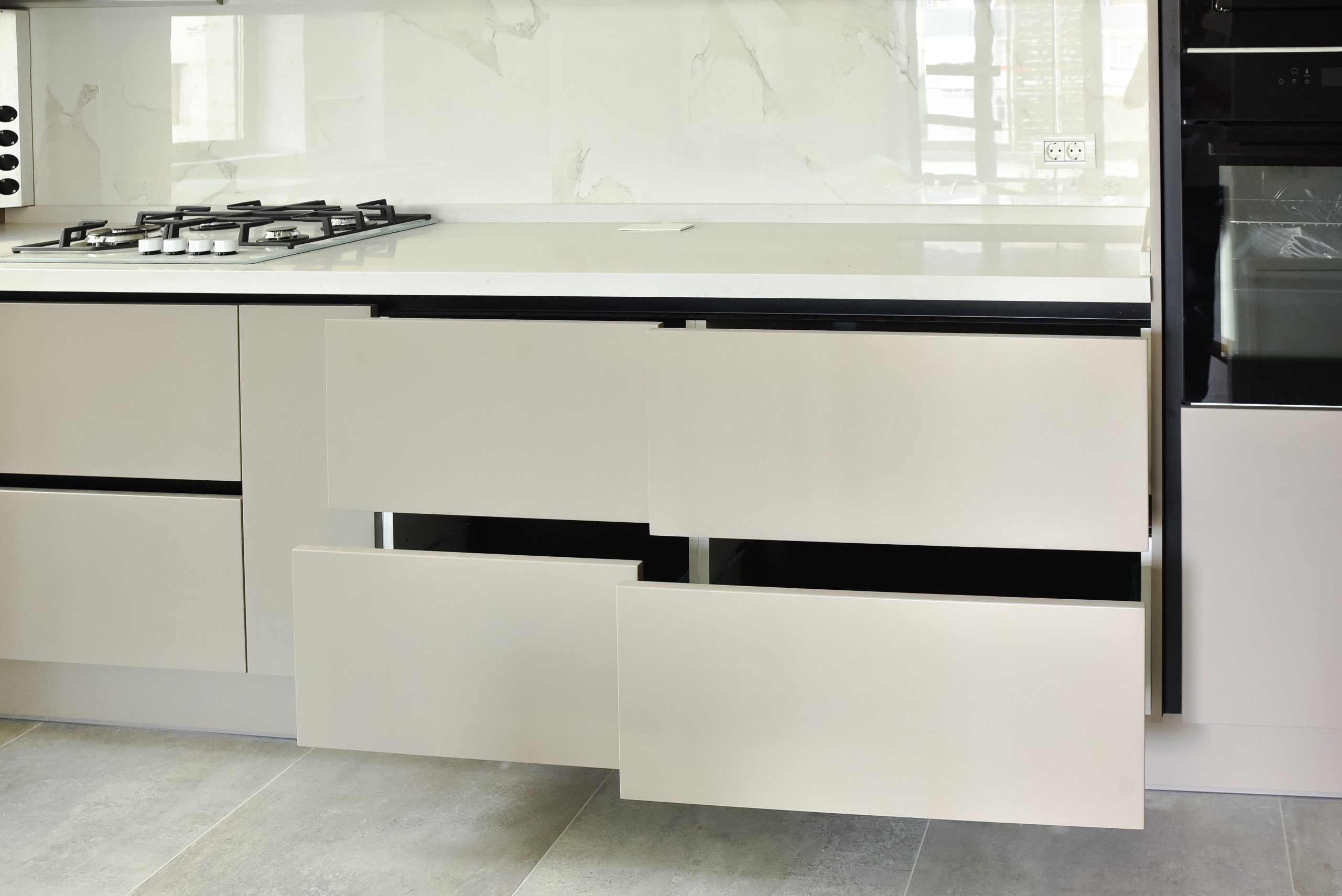 Practic, în loc să tragi de un mâner, introduci degetele în spațiul creat de profil și deschizi sertarul sau ușa cu ușurință. Acest sistem oferă un aspect curat, minimalist și elegant, fiind foarte popular în designul bucătăriilor moderne.