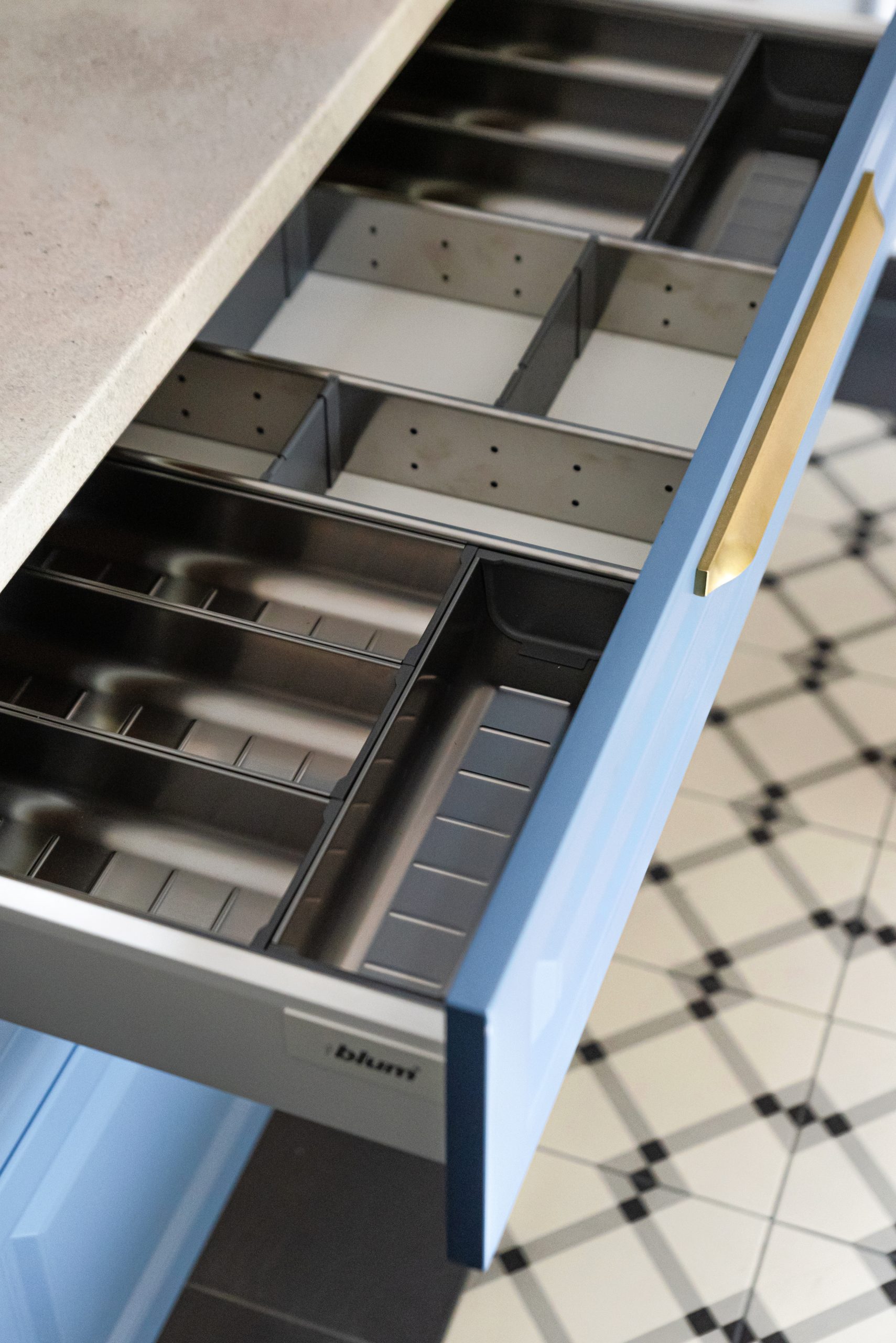 Sertarele incluse sunt Blum TandemBox, cu extracție totală și sistem de amortizare, suportând o greutate de până la 30 kg.