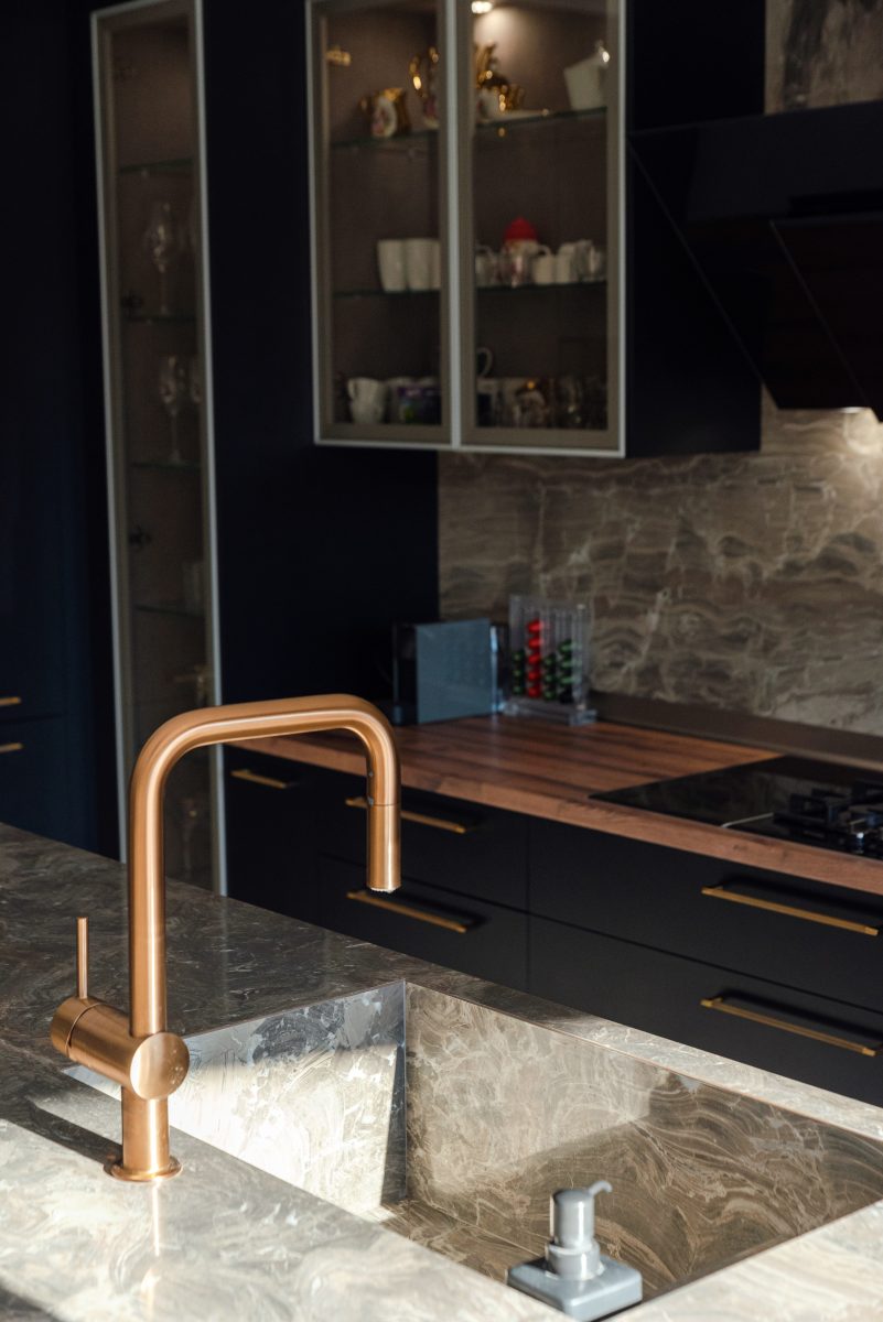 Bucătăria din MDF vopsit antracit se remarcă prin eleganța profundă și designul modern, completat de corpurile suspendate cu uși din sticlă și ramă din aluminiu, ce adaugă un plus de rafinament și transparență. Blatul melaminat cu imitație de lemn aduce căldură și echilibru vizual, în timp ce mânerele aurii antichizate oferă un accent sofisticat și distinct. Insula cu blat din quartz completează ansamblul prin funcționalitate și un aspect premium, devenind punctul central al bucătăriei. Rezultatul este un spațiu elegant, bine organizat și perfect adaptat unui stil contemporan cu influențe clasice.